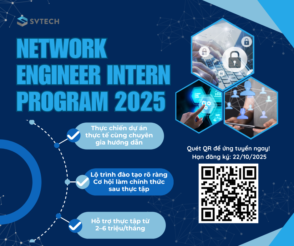 NETWORK ENGINEER INTERN PROGRAM 2025 được SVTECH triển khai nhằm tìm kiếm và bồi dưỡng những kỹ sư trẻ trong lĩnh vực hạ tầng mạng, bảo mật và hệ thống, góp phần xây dựng đội ngũ kỹ sư nòng cốt cho ngành công nghệ Việt Nam. Chương trình mang đến nhiều đãi ngộ hấp dẫn, cơ hội đào tạo chuyên sâu, và trải nghiệm thực tế trong các dự án lớn cùng đội ngũ chuyên gia hàng đầu tại SVTECH.