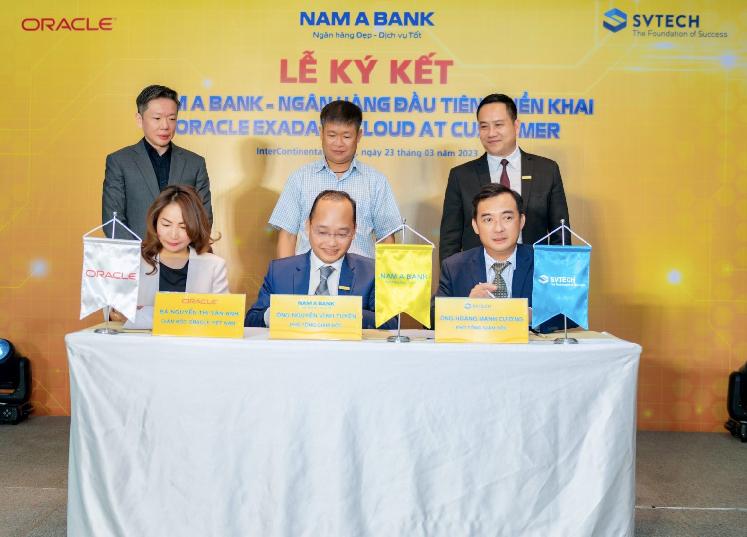 (Theo Cafe F) – Sáng 23/03/2023, tại TP.HCM đã diễn ra Lễ ký kết hợp tác giữa Ngân hàng TMCP Nam Á (Nam A Bank) cùng Tập đoàn ORACLE và Công ty Cổ phần phát triển Công nghệ viễn thông tin học Sun Việt (SVTECH) về việc triển khai giải pháp Nền tảng điện toán đám mây Exadata đặt tại Khách hàng của Oracle (Oracle Exadata Cloud at Customer).