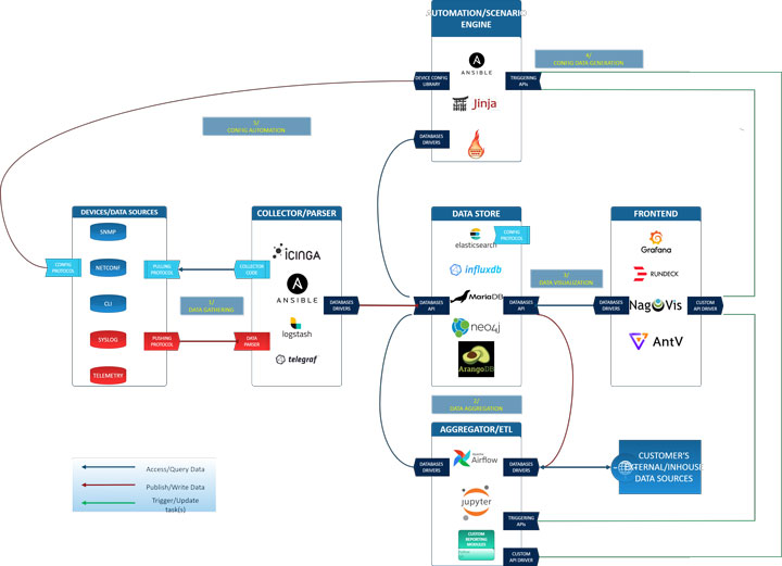 - Data, network visualization, and automation task tracking/input are handled through some of the most versatile web frontends for this usage, also custom specialized visualization for network topology state tracking is the highlight of the project.